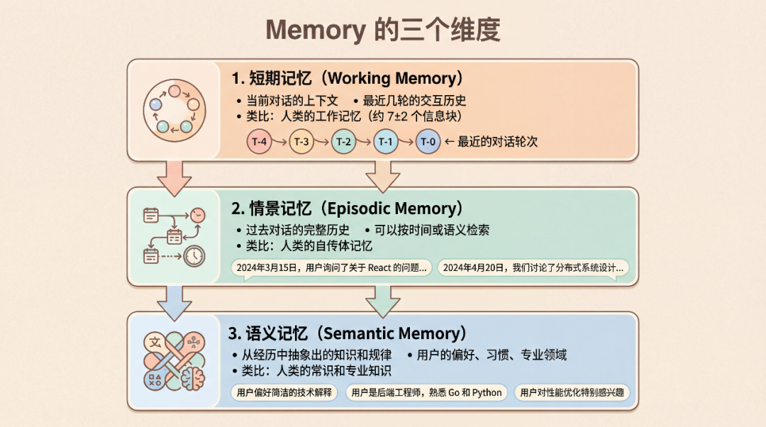 Memory 系统为 Agent 引入了时间的维度。一个完整的 Memory 系统通常包含三个层次: