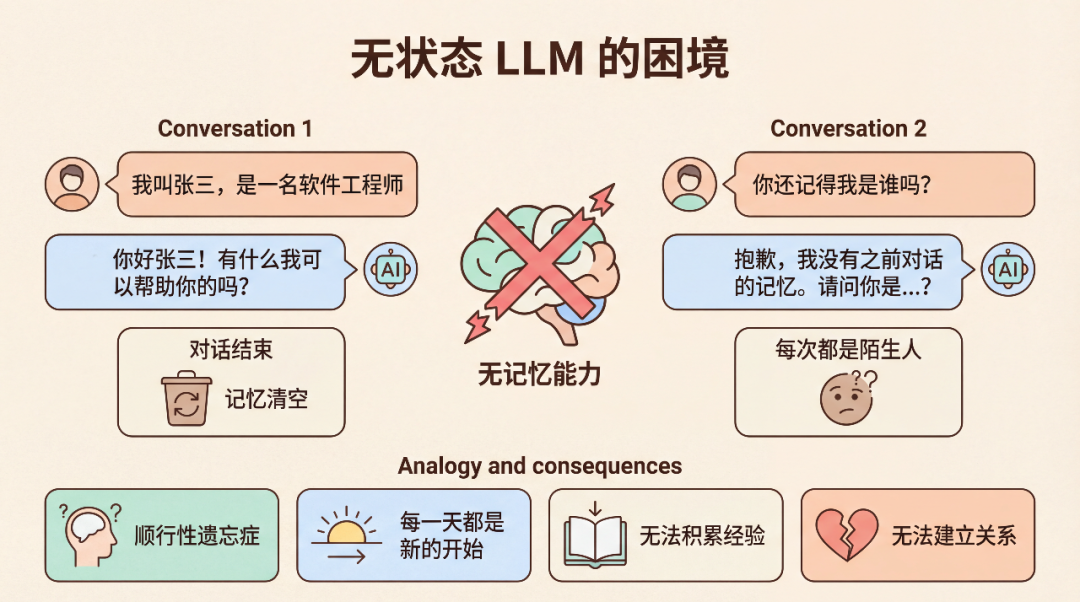 原始的 LLM 也是无状态的。每一次对话都是新的开始,它不记得上一次对话的内容,不记得用户是谁,不记得之前犯过什么错误。