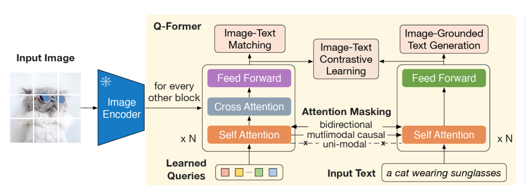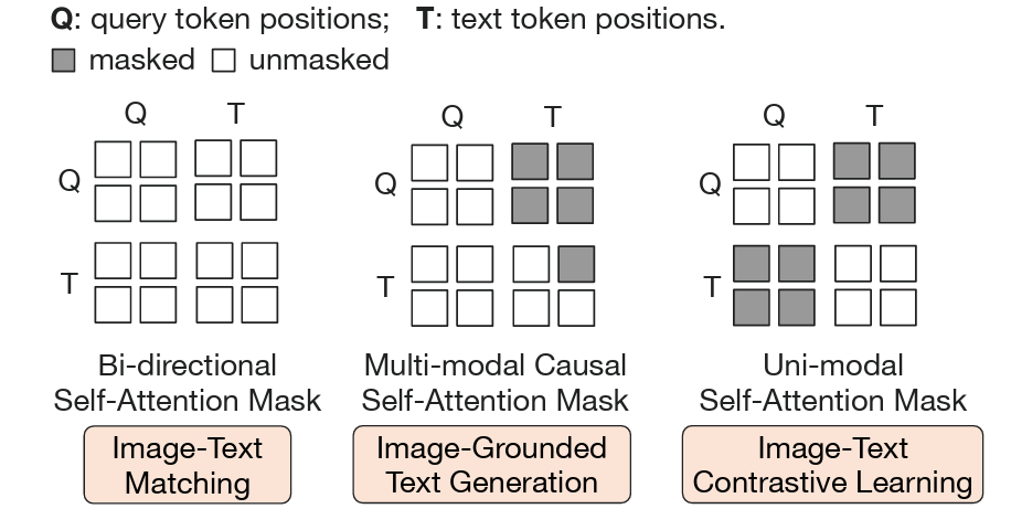 Q-Former 分两个阶段进行预训练。第一阶段,图像编码器被冻结,Q-Former通过三个损失函数进行训 练,并且使用三个不同的Mask以防止Attention信息泄漏(因为Attention权重是共享的):