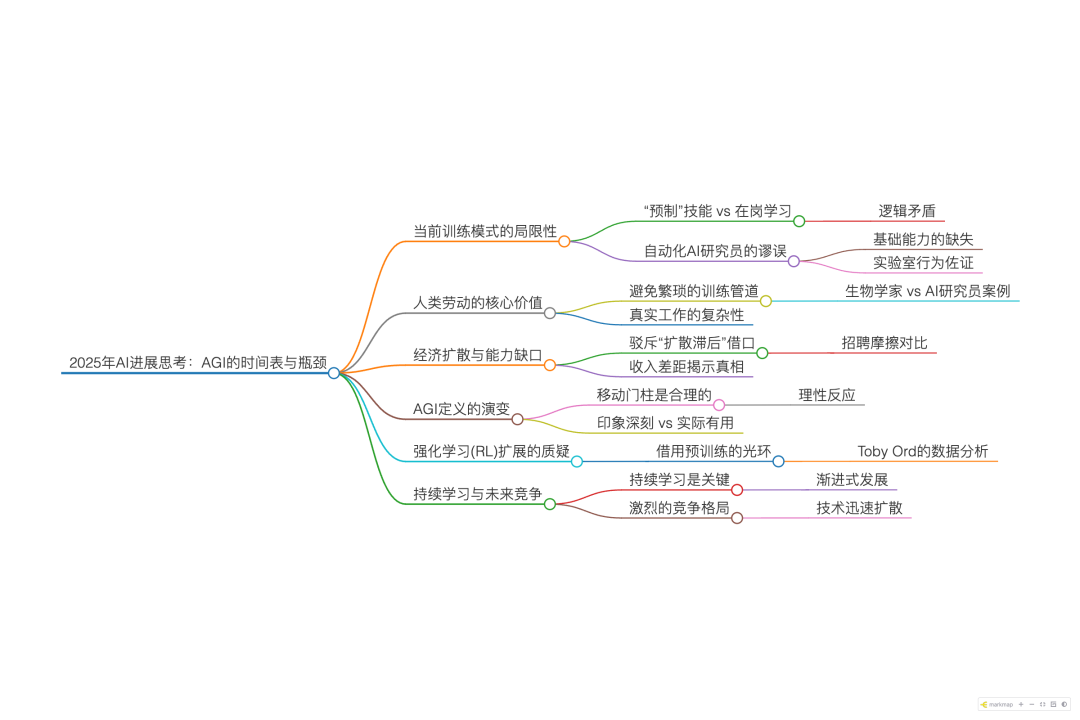 本期内容源自一著名AI播客博主Dwarkesh基于 2025 年视角的复盘。核心冲突在于**“短期极速派”与“技术现实主义”的对撞**:前者认为通过 RLVR(基于可验证结果的强化学习)可以迅速通往 AGI;后者则尖锐指出,目前各大实验室疯狂进行“技能注入(Skill Baking)”的行为,恰恰暴露了模型缺乏核心的泛化与自学能力。
