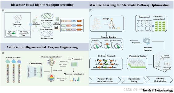 (C)机器学习辅助的代谢途径优化:途径优化分为三个连续阶段:(i)设计阶段:利用 Golden Gate 组装技术,将启动子 - 开放阅读框 - 终止子(PRO-ORF-TER, POT)元件模块化;(ii)测试阶段:在可控发酵条件下,对表型鉴定后的菌株文库进行产物滴度定量检测;(iii)优化阶段:构建梯度提升回归模型,建立元件组合方式与产物滴度的关联图谱,并基于模型的预测置信区间,指导组合参数的优化调整。这种计算模拟与实验验证的整合策略,可实现生物合成效率的系统性提升。