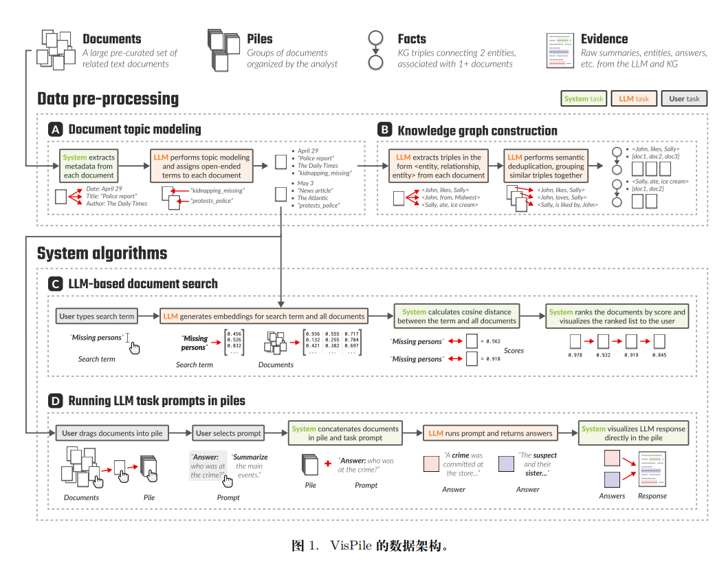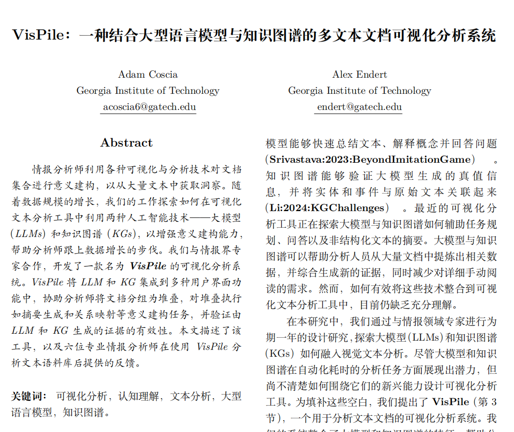 本文介绍VisPile系统——一款创新性可视化分析工具,通过整合大语言模型(LLM)与知识图谱(KG)技术,革新情报分析师对海量文本文档的分析方式。该系统支持文档智能分组、自动摘要生成、关系映射等功能,并经六位专业情报分析师验证,展现出显著提升文本分析效率与洞察深度的潜力。