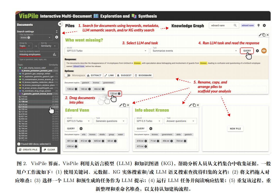 VisPile是一个开源的可视化分析工具,专为文本文档分析而设计。该系统将LLM和KG深度集成到文档搜索、过滤、归集、分析和验证的全流程中。