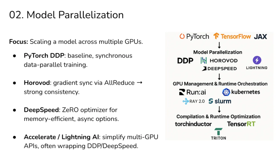 通常情况下,单块 GPU 不足以运行你的 LLM,这时就需要横向扩展,进入 “并行化” 层面。这里的核心挑战不是计算本身,而是同步问题。梯度必须在 GPU 之间传输,参数需要分片存储,优化器状态也得拆分处理。