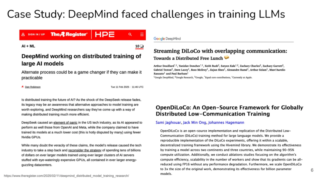 核心结论:DeepMind 报告称,即便使用数千块 GPU,分布式训练仍会陷入停滞,少数慢节点会拖慢全局同步。在数据并行训练中,整个任务会等待最慢的工作节点。Ray 和 Kubernetes 能通过弹性管理(节点故障时重新分配任务)和调度(避免 GPU 卡在队列中)来解决这个问题。