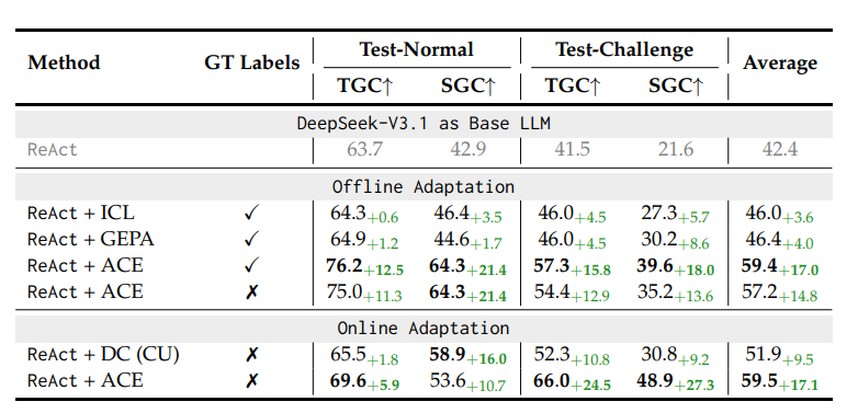 更关键的是,ACE 不需要标注数据,仅通过执行反馈(如代码执行成败、API 调用结果)就能实现自改进,在离线适配场景中比基线模型性能提升 17.0%,在线适配场景提升 17.1%。