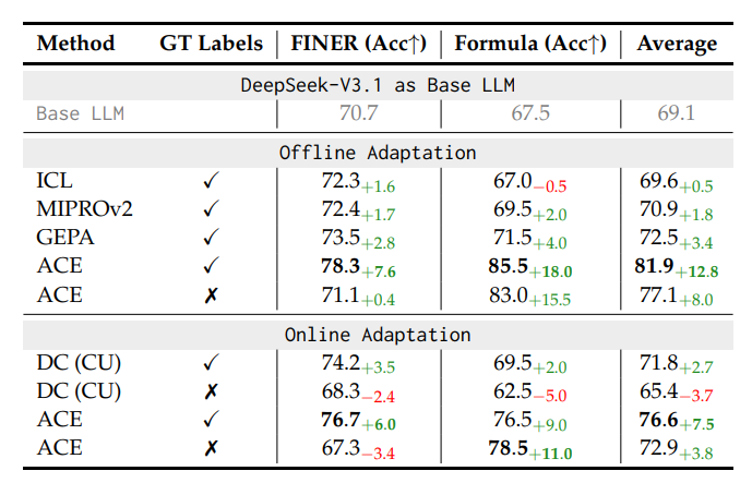 在 FiNER(金融实体识别)和 Formula(金融数值推理)两大基准测试中,ACE 构建的领域专属操作手册发挥了巨大作用: