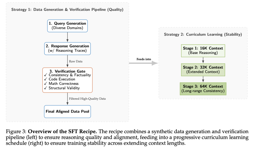 基于这些发现,论文设计了两阶段课程:第一阶段建立代码、数学、STEM和工具使用的基础能力,上下文从16K扩展至32K;第二阶段注入高粒度合成数据,重新生成推理轨迹,上下文扩展至64K。数据验证流程包含一致性检查、代码执行测试、数学正确性验证和结构有效性检查。