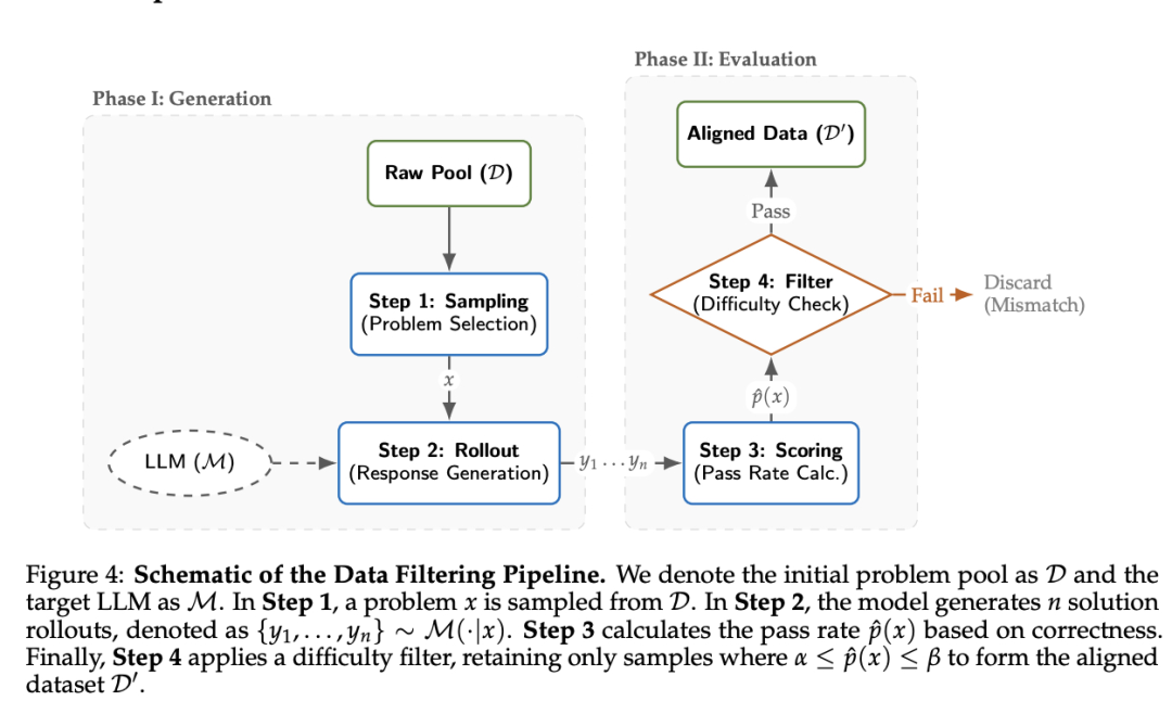 为解决难度对齐问题,论文提出LLM-as-a-data-filtering方法:对每个问题生成5个rollout,仅保留通过率在目标区间内的样本。数学推理保留**(0, 0.8]区间,指令遵循保留更严格的(0, 0.4]**区间。其他关键技术包括:扩大剪裁范围至ε∈[0.28,0.40]以加速收敛;移除长度惩罚以鼓励长链推理;采用混合策略轨迹复用提高效率;采用多任务RL框架避免单一领域优化导致其他能力退化。