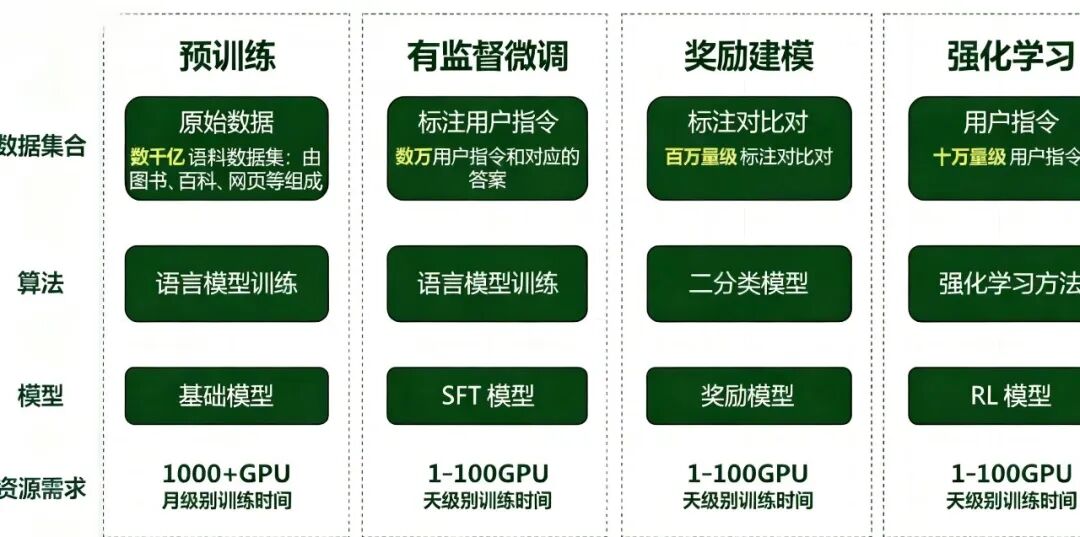 以OpenAI的公开信息,主要包含四个阶段:预训练、有监督微调、奖励建模和强化学习。每个阶段所需的数据集规模、算法类型、产生的模型、时间和GPU资源都不相同: