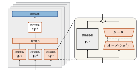 高效微调:微调部分参数,旨在仅训练少量参数就使模型适应下游任务。例如LoRA大语言模型的低秩适配器,算法结构如下:
