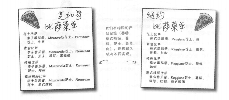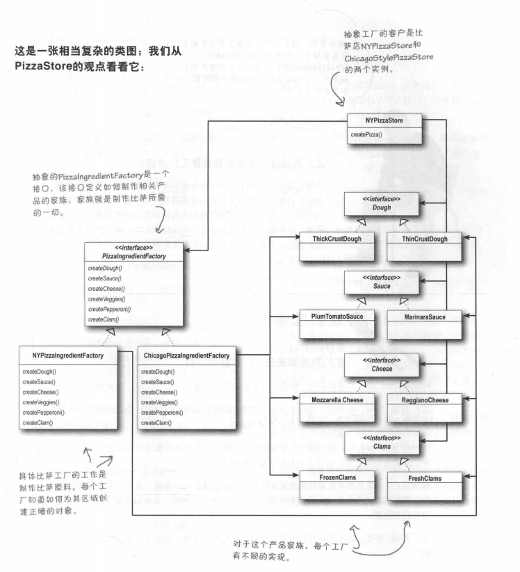 Pizza的代码用所组合的工厂生产披萨所用的原料。所生产的原料依赖所用的工厂。Pizza类不关心,它知道如何制作披萨。现在,Pizza从区域原料差异解耦,无论工厂是在奥斯汀、纳什维尔还是其他地方,Pizza类可以轻易地复用。