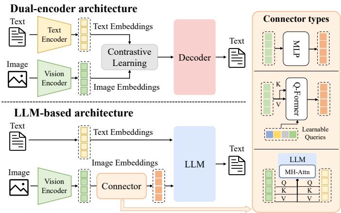Early VLU models primarily focused on aligning visual and textual modalities using dual-encoder architectures, wherein images and text are first encoded separately and then jointly reasoned over via aligned latent representations, including CLIP [22], ViLBERT [54], VisualBERT [55], and UNITER [56]. Although these pioneering models established key principles for multimodal reasoning, they depended heavily on region-based visual preprocessing and separate encoders, limiting the scalability and generality of the mode. With the emergence of powerful LLMs, VLU models have progressively shifted toward decoder-only architectures that incorporate frozen or minimally fine-tuned LLM backbones. These methods primarily transform image embeddings through a connector with different structures, as illustrated in Fig. 2. Specifically, MiniGPT-4 [57] utilized a single learnable layer to project CLIP-derived image embeddings into the token space of Vicuna [58]. BLIP-2 [53] introduced a querying transformer, to bridge a frozen visual encoder with a frozen LLM (e.g., Flan-T5 [59] or Vicuna [58]), enabling efficient vision-language alignment with significantly fewer trainable parameters. Flamingo [60] employed gated cross-attention layers to connect a pretrained vision encoder with a frozen Chinchilla [61] decoder.