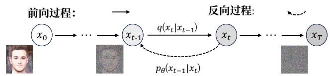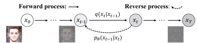 Diffusion models. Diffusion models (DM) formulate generation as a pair of Markov chains: a forward process that gradually corrupts data x 0 x_0 x0 by adding Gaussian noise over T T T timesteps to produce x T x_{T} xT , and a reverse process that learns a parameterized distribution to iteratively denoise back to the data manifold [19], [69], [70]. Formally, as shown in Fig. 3 in the forward process, given the date distribution x 0 ∼ q ( x 0 ) x_0 \sim q(x_0) x0∼q(x0) , at each step t t t , the data x t x_{t} xt is noised: