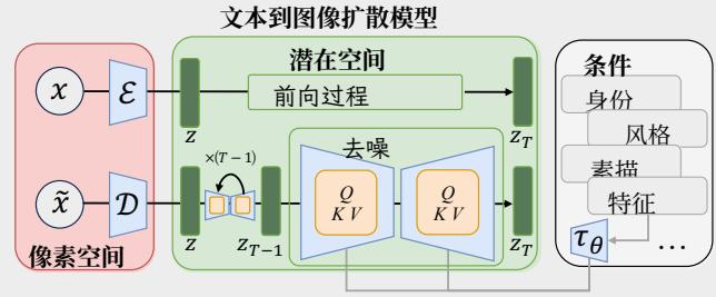 图3.基于扩散的文本到图像生成模型示意图,展示了除了文本之外的多种条件如何被引入以引导生成结果。图像生成被表述为一对马尔可夫链:正向过程通过加入高斯噪声逐步破坏输入数据,反向过程则学习一个参数化分布以迭代去噪,恢复到输入数据。