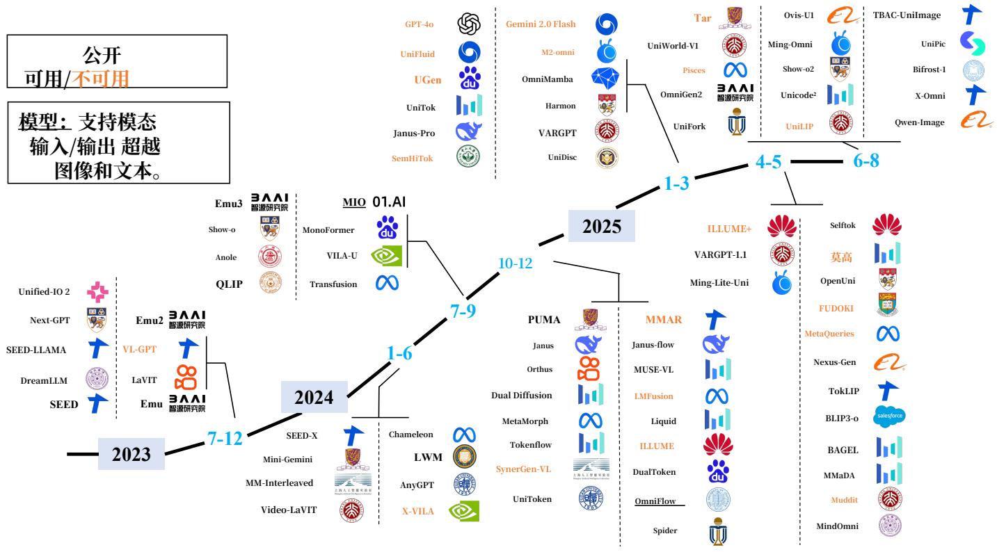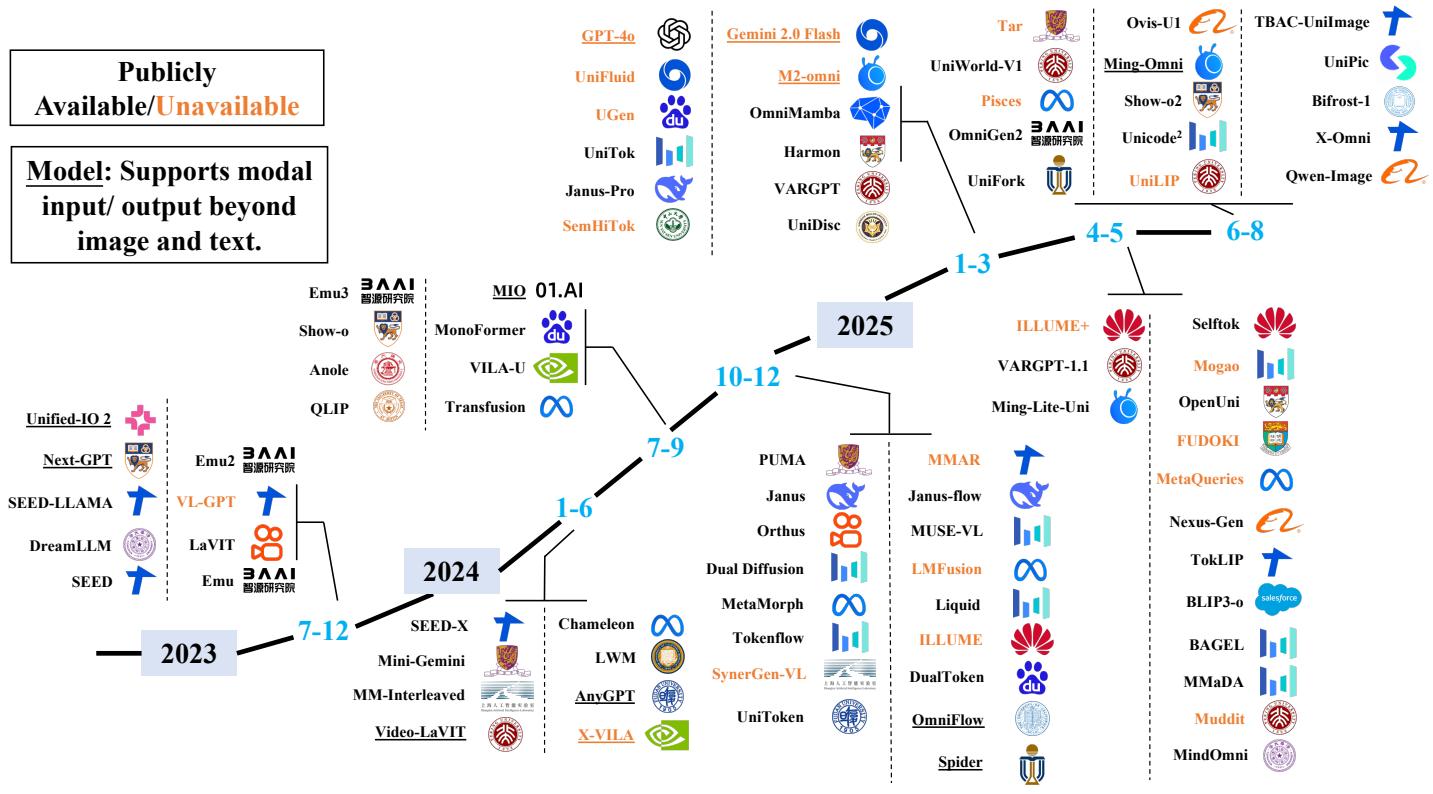图1.公开可用和不可用的统一多模态模型时间线。图中模型按发布年份分类,涵盖2023年至2025年。图中带下划线的模型代表任意到任意多模态模型,能够处理超出文本和图像的输入或输出,如音频、视频和语音。该时间线突出了该领域的快速增长。