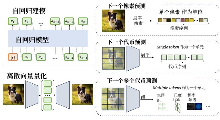 图4.自回归模型核心组件示意图,包括自回归序列建模和离散向量量化。现有自回归模型大致可分为三类:下一个像素预测将图像展平为像素序列;下一个代币预测通过视觉分词器将图像转换为代币序列;下一个多个代币预测在自回归步骤中输出多个代币。