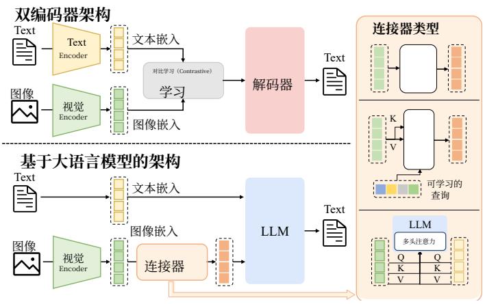 图2. 多模态理解模型的架构,包含多模态编码器、一个连接器和一个大语言模型。多模态编码器将图像、音频或视频转换为特征,这些特征由连接器处理作为大语言模型的输入。连接器的架构大致可分为三类:基于投影的、基于查询的和基于融合的连接器。
