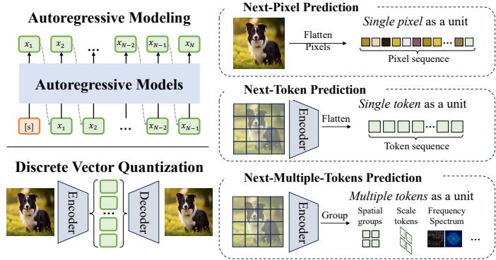 Fig. 4. Illustration of core components in autoregressive models, including the autoregression sequence modeling and discrete vector quantization. Exiting autoregressive models can be roughly divided into three types: Next-Pixel Prediction flattens the image into a pixel sequence, Next-Token Prediction converts the image into a token sequence via a visual tokenizer, and Next-Multiple-Token Prediction outputs multiple tokens in an autoregressive step.