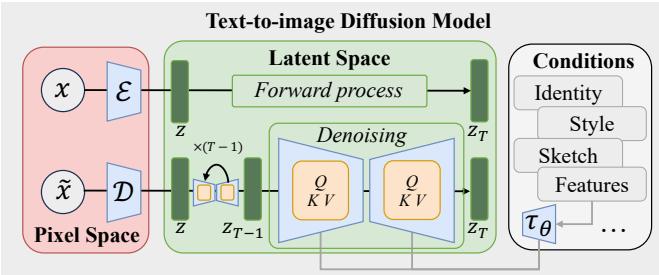 Fig. 3. Illustration of diffusion-based text-to-image generation models, where various conditions beyond text are introduced to steer the outcomes. The image generation is formulated as a pair of Markov chains: a forward process that gradually corrupts input data by adding Gaussian noise, and a reverse process that learns a parameterized distribution to iteratively denoise back to the input data.