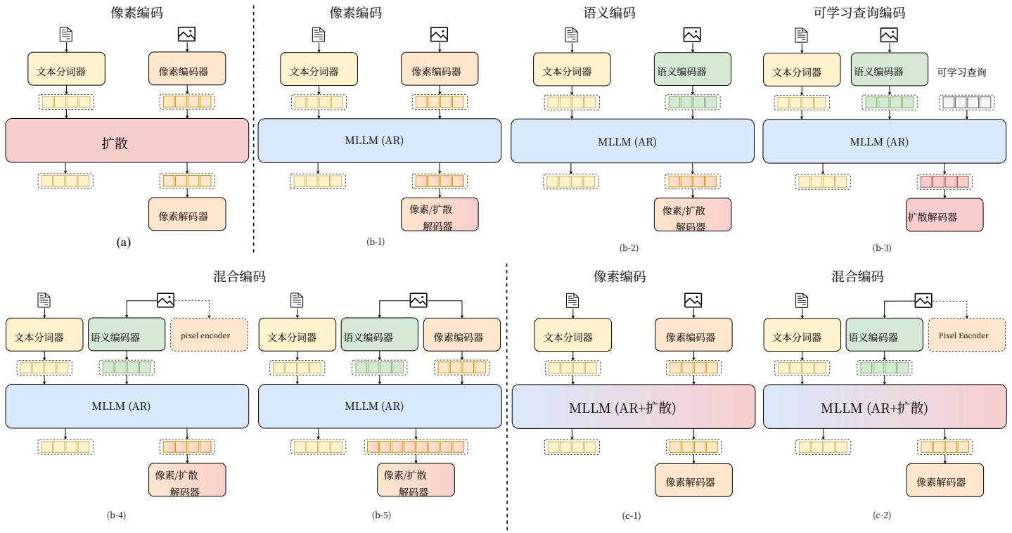为了全面概述统一多模态模型的现状(如图1所示),并为未来的研究工作提供参考,我们撰写了这篇综述。首先介绍多模态理解和图像生成的基础概念与最新进展,涵盖基于自回归和基于扩散的范式。接着回顾现有的统一模型,并将它们归类为三种主要的架构范式:基于扩散的、基于自回归的,以及融合自回归与扩散机制的混合方法,