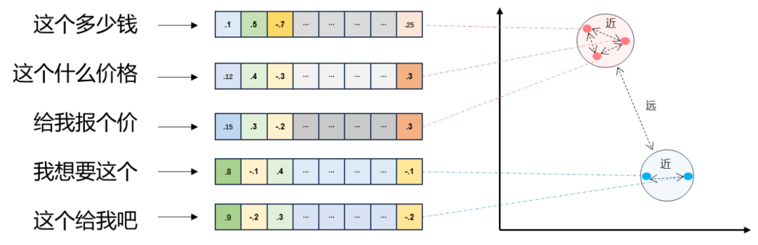 - 向量之间可以计算距离,距离远近对应语义相似度大小。