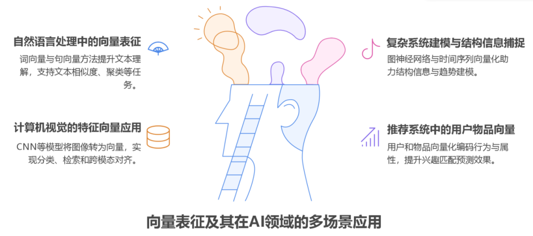 向量表征是人工智能领域的基础,通过将文本、图像、声音等复杂信息转化为高维向量(Embedding),为机器学习模型提供统一的数学描述方式,实现语义理解与处理。