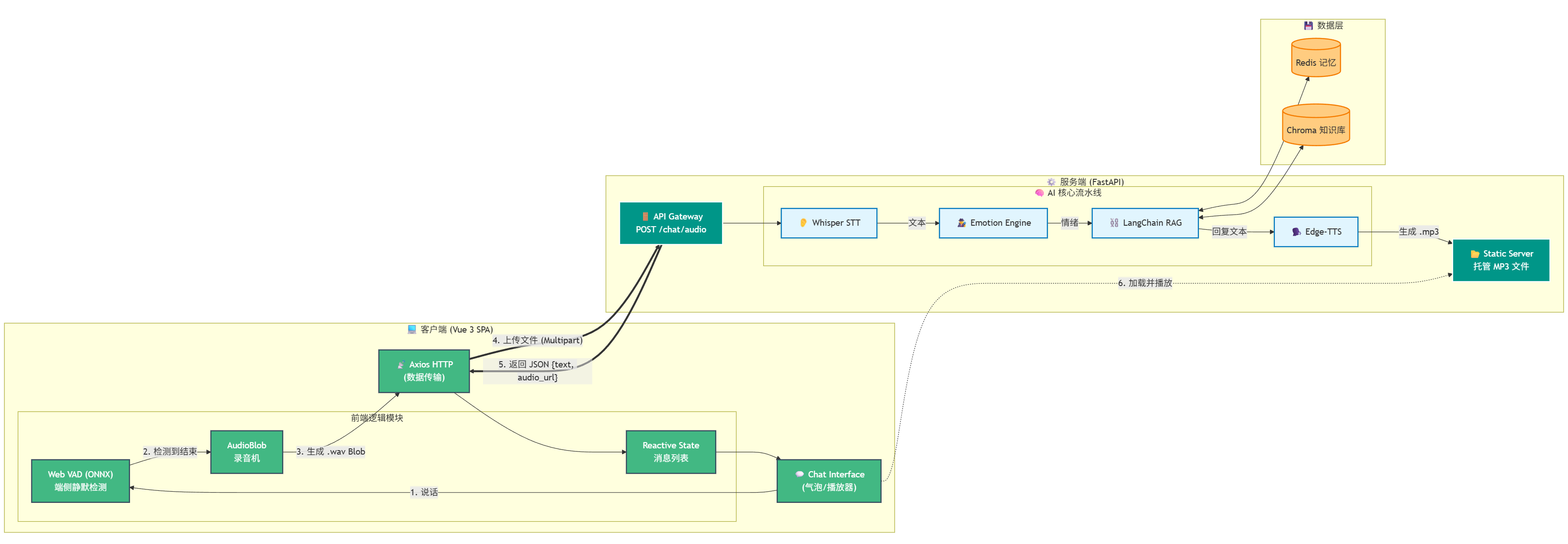 前端 (Vue 3):不再仅仅是展示层,它承担了 VAD(语音活动检测) 的计算任务。这样做的好处是零延迟——用户刚闭嘴,浏览器立马知道,不需要把静音流上传到服务器浪费带宽。