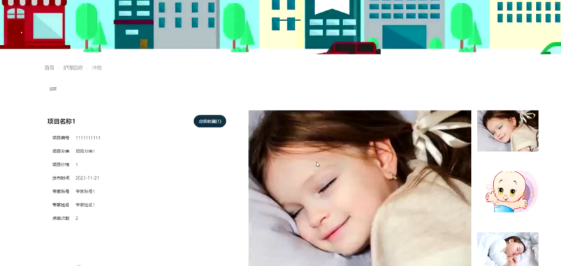 家长点击护理信息,在护理信息页面的搜索栏输入项目名称、项目分类、专家姓名等信息,进行查询,还可以查看项目编号、项目名称、项目分类、项目封面、项目价格、发布时间、专家账号、专家姓名、点击次数、收藏数,如有需要可以收藏操作,如图5-4所示: