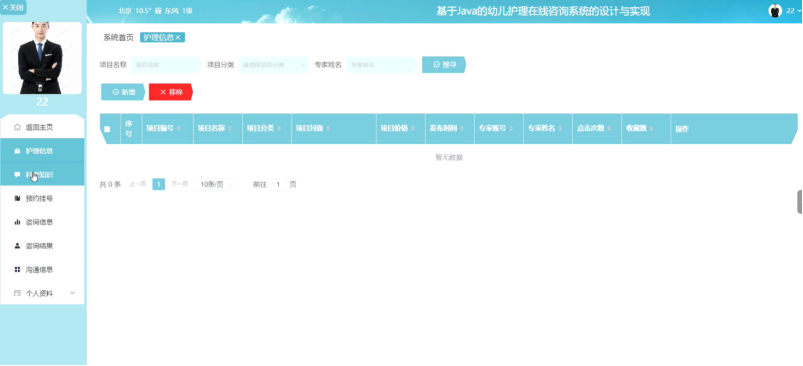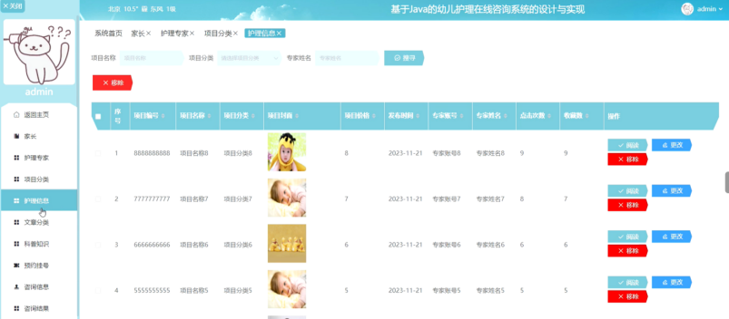 管理员点击护理信息,在护理信息页面对项目编号、项目名称、项目分类、项目封面、项目价格、发布时间、专家账号、专家姓名、点击次数、收藏数等信息,可以搜寻、新增或者移除护理信息等操作。如图5-19所示: