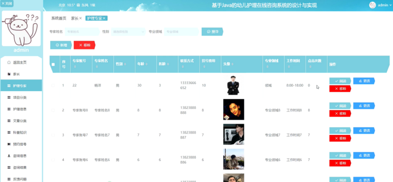 管理员点击护理专家,在护理专家页面对专家账号、专家姓名、性别、年龄、医龄、联系方式、挂号费用、头像、专业领域、工作时间、点击次数等信息,可以搜寻,新增或移除护理专家等操作。如图5-9所示: