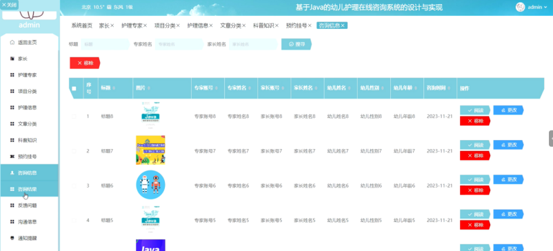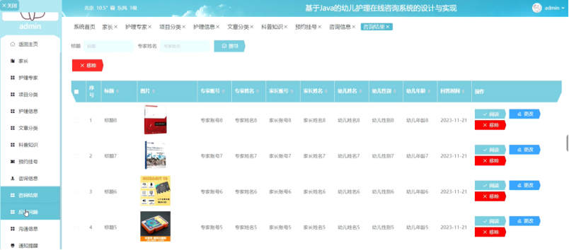 管理员点击咨询信息,在咨询信息页面对标题、图片、专家账号、专家姓名、家长账号、家长姓名、幼儿姓名、幼儿性别、幼儿年龄、咨询时间等信息,可以搜寻或删除咨询信息等操作。如图5-13所示: