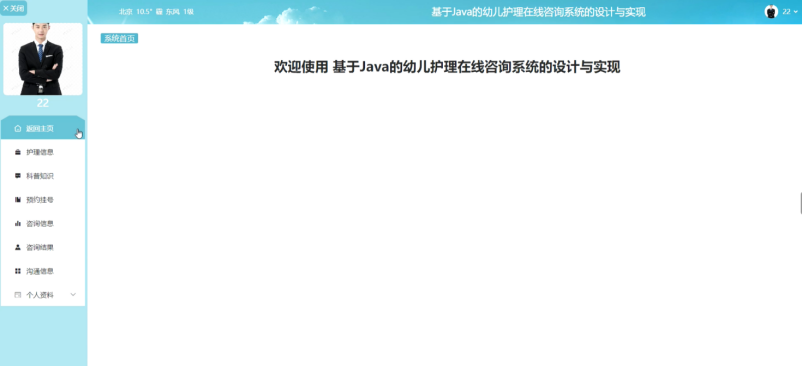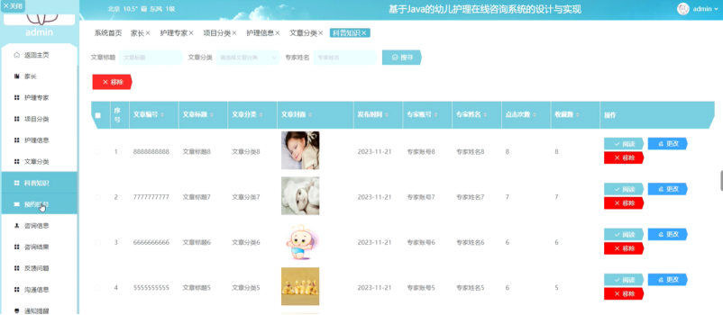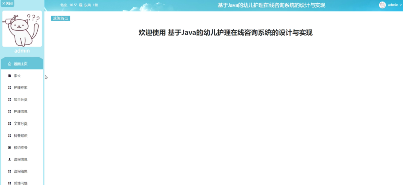 管理员进入主页面,主要功能包括对返回主页、家长、护理专家、项目分类、护理信息、文章分类、科普知识、预约挂号、咨询信息、咨询结果、反馈问题、沟通信息、通知提醒、系统管理、个人资料等进行操作。管理员主页面如图5-7所示: