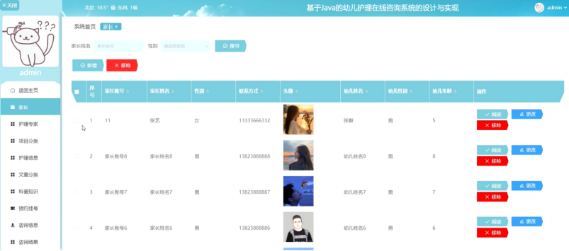 管理员点击家长,在家长页面对家长账号、家长姓名、性别、联系方式、头像、幼儿姓名、幼儿性别、幼儿年龄信息,可以搜寻,新增或删除家长信息等操作。如图5-8所示: