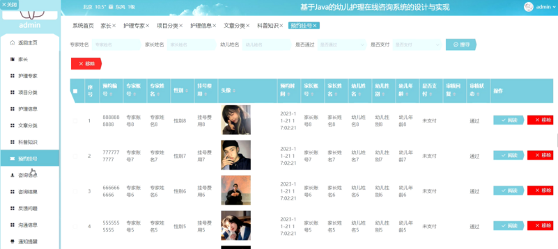 管理员点击预约挂号,在预约挂号页面对预约编号、专家账号、专家姓名、性别、挂号费用、头像、预约时间、家长账号、家长姓名、幼儿姓名、幼儿性别、幼儿年龄、是否支付、审核回复、审核状态等信息,可以搜寻或删除预约挂号等操作。如图5-12所示: