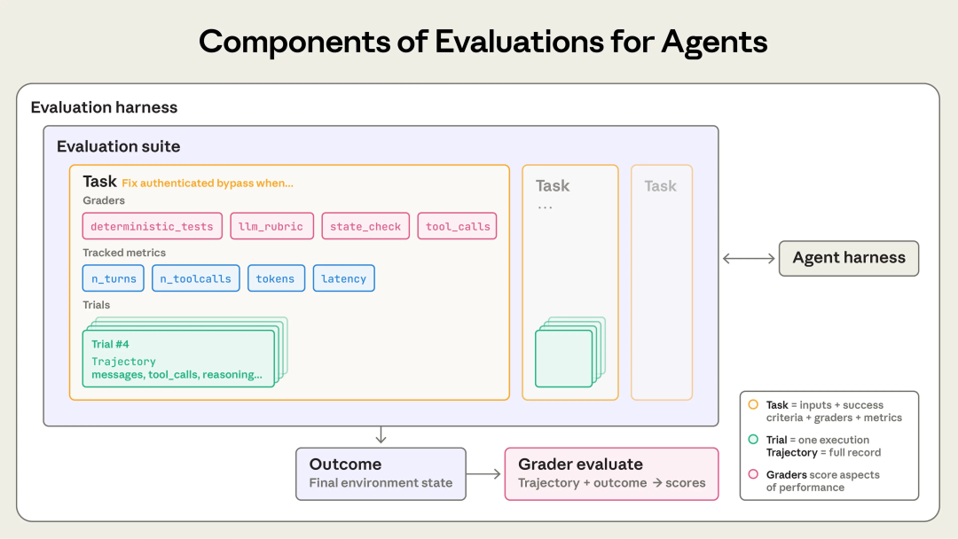 - 智能体框架(或脚手架)是使模型能够充当智能体的系统:它处理输入,编排工具调用,并返回结果。当评估"一个智能体"时,实际上是在评估框架和模型的协同工作。例如,Claude Code 就是一个灵活的智能体框架,Anthropic 团队通过 Agent SDK 使用其核心组件来构建长时运行智能体框架。
