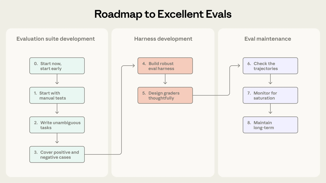 本节提供了从没有评估到建立可信评估的实用建议,这些建议都经过了实战检验。可以把这看作是评估驱动的智能体开发路线图:尽早定义成功,清晰地衡量它,并持续迭代。