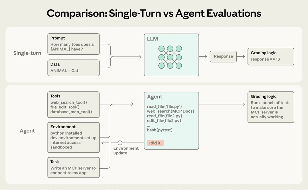 在简单的评估中,智能体处理一个提示,评分器检查输出是否符合预期。在更复杂的多轮评估中,编码智能体会接收工具、任务(比如构建 MCP 服务器)和环境,执行"智能体循环"(工具调用和推理),并用实现结果更新环境。然后通过单元测试来验证 MCP 服务器是否正常工作。
