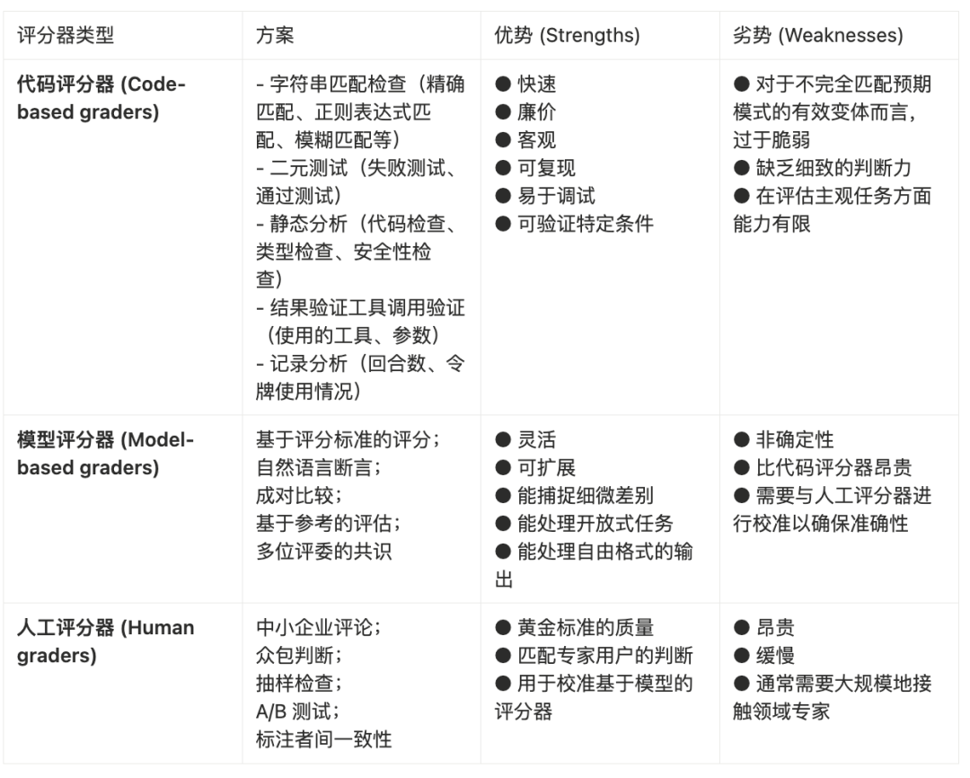 选择合适的评分器(Grader)是评估设计的核心环节。不存在万能的评分器,最佳实践通常是根据任务的特性,组合使用代码、模型和人工这三种评分器。每种评分器都负责评估试验记录(Transcript)或最终结果(Outcome)的某个方面。