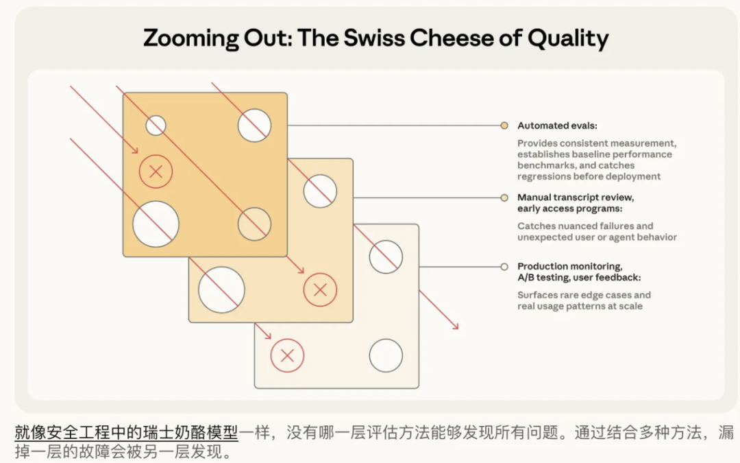 在安全工程领域有一个著名的“瑞士奶酪模型”,它指出没有任何单一的安全层能够捕获所有风险。同样,没有任何单一的评估方法能够揭示AI智能体性能的所有方面。一个全面、立体的性能视图来自于多种方法的组合。