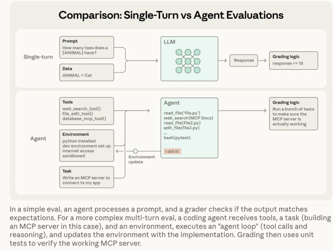 掌握了这些术语后,我们就能更清晰地理解现代AI智能体评估的复杂性。与传统的单轮评估(一个提示、一个响应、一次评分)不同,现代AI智能体的评估通常是多轮评估(multi-turn evaluation)。一个简单的评估可能只是检查输出是否符合预期,而一个复杂的多轮评估(例如,要求智能体构建一个MCP服务器)则涉及智能体调用工具、执行代码、更新环境并最终通过单元测试来验证其工作成果。