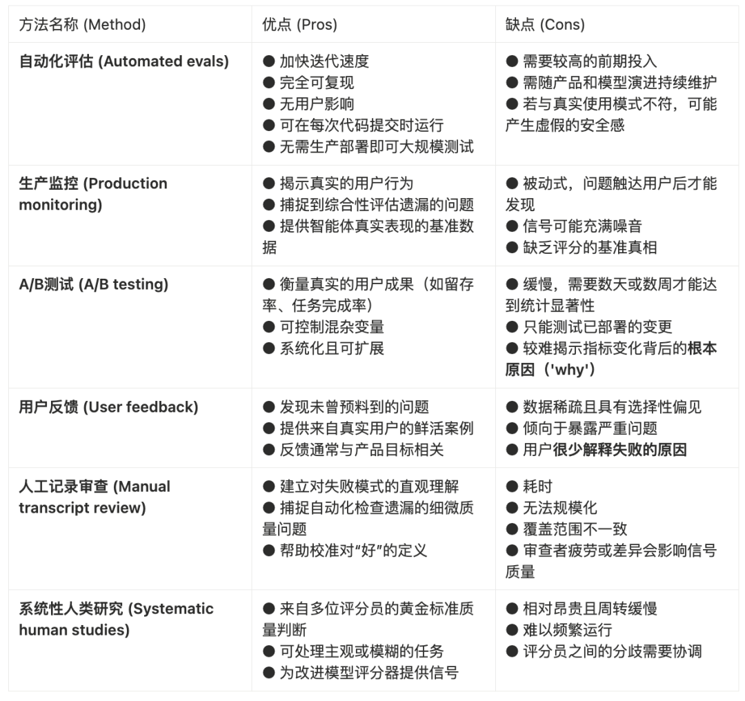 这些方法共同构成了一个多层次的质量保障体系,并映射到智能体开发的不同阶段。自动化评估是预发布和持续集成/持续部署(CI/CD)阶段的第一道防线。生产监控在发布后启动,用于发现真实世界中的问题。A/B测试用于验证重大的产品变更。用户反馈和人工记录审查是持续性的实践,用于填补空白。而系统性人类研究则保留用于校准LLM评分器或评估那些以人类共识为最终标准的主观任务。