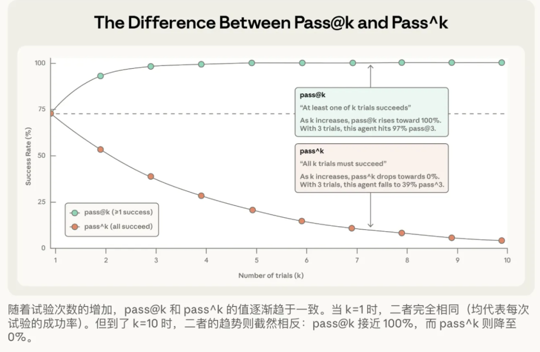 k的增加,pass^k的分数会下降,因为它对一致性的要求越来越高。例如,一个单次成功率为75%的智能体,在连续3次试验中全部成功的概率pass^3仅为 (0.75)³ ≈ 42%。 - • 应用场景:适用于对可靠性和一致性要求极高的场景,例如面向客户的自动化智能体,用户期望每次交互都能得到正确的结果。
