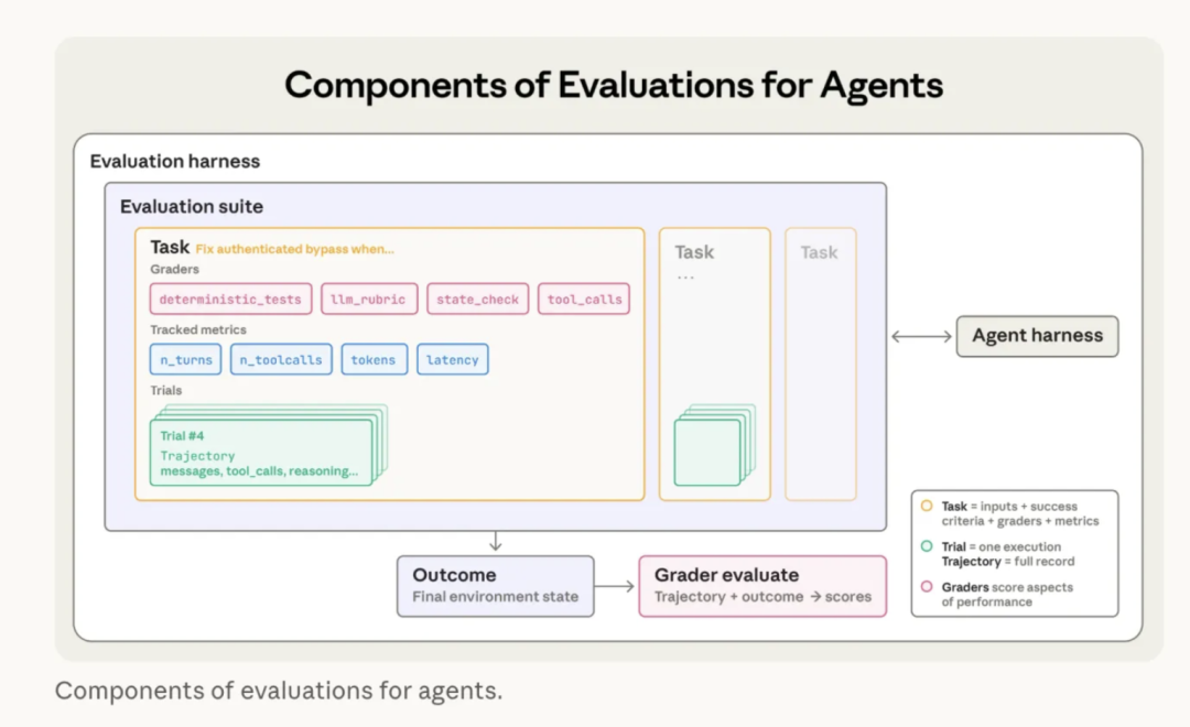 - • 评估套件 (Evaluation suite):为衡量特定能力或行为而设计的一系列任务集合。套件中的任务通常共享一个广泛的目标,如一个客户支持评估套件可能包含退款、取消订单和升级处理等任务。