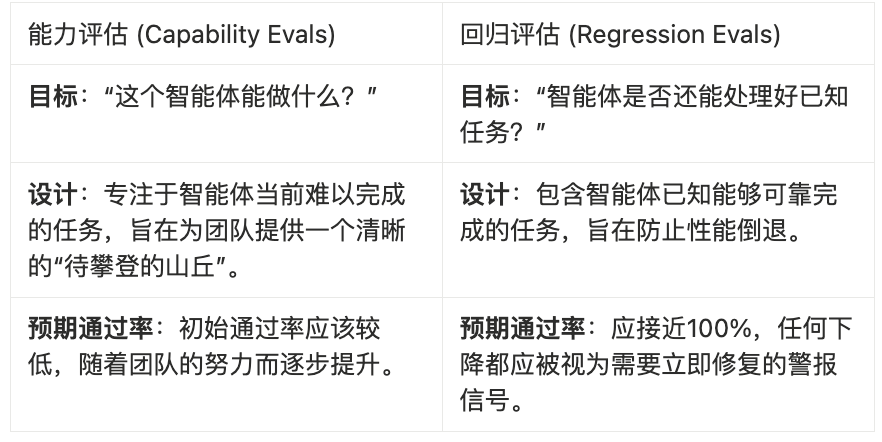 这两种评估类型之间存在一种动态的转化关系。当一项能力评估的通过率变得足够高时,它就可以“毕业”并被纳入回归评估套件中。曾经用于衡量“我们是否能做到”的任务,转变为衡量“我们是否仍能可靠地做到”的基准。