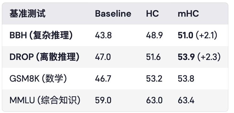 (值得注意的是,与HC相比,mHC进一步增强了模型的推理能力,在BBH上提升2.1%,在DROP上提升2.3%)