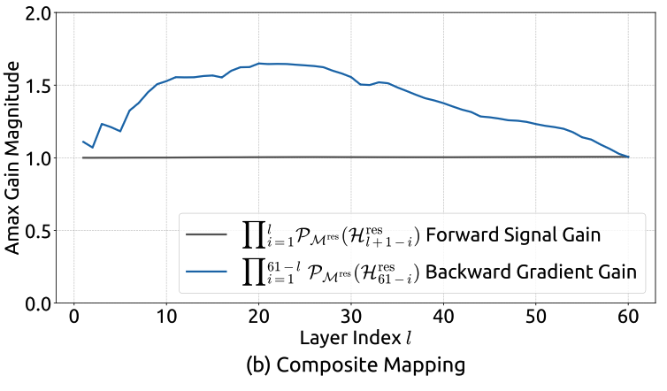 “the composite mapping ∏^(L-l)(i=1) H^res(L-i) inevitably deviates from the identity mapping. Consequently, the signal magnitude is prone to explosion or vanishing during both the forward pass and backpropagation.”