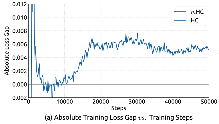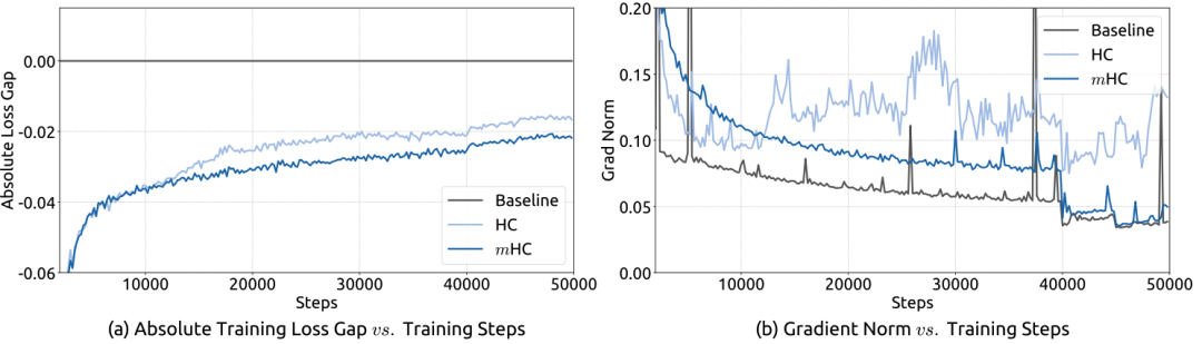显示 HC 在27B模型训练中出现明显的 loss spike(损失突增),在12k步左右发生训练不稳定