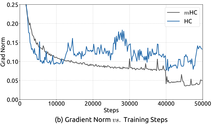 “mHC effectively mitigates the training instability observed in HC, achieving a final loss reduction of 0.021 compared to the baseline.”