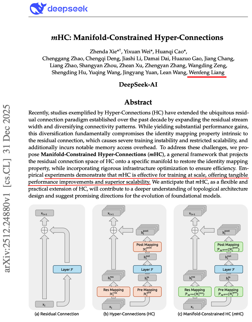 作为一名只信数据的算法研究员,我翻出了 DeepSeek 在 10天前(2025年12月31日) 刚刚挂在arXiv上的重磅论文——《mHC: Manifold-Constrained Hyper-Connections》。